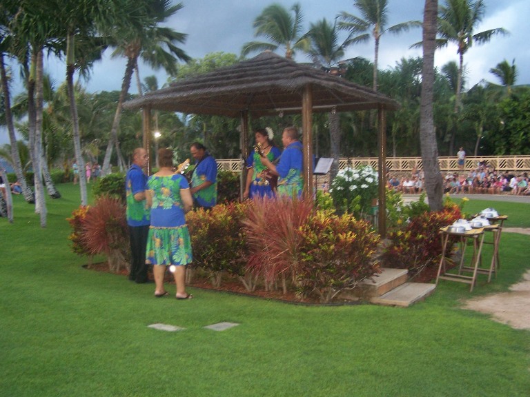 Late Saturday afternoon the bus picked us up from the hotel for the drive to Paradise Cove on the south west coast of the island. When we arrived we were presented with shell leis, shown where we would be sitting for dinner and then had free time to wander around looking at the various presentations on offer.